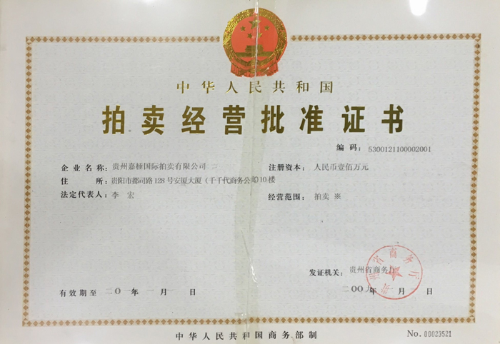 貴州嘉棰國際拍賣有限公司是主要從事動產、不動產、無形資產和文物藝術品拍賣業務的大型綜合性拍賣企業,是中國拍賣行業協會會員,貴州省拍賣行業協會理事單位,中國拍賣行業協會AA級資質企業,貴州省連續十一年重合同守信用企業,全省拍賣先進企業,貴州省公物拍賣人。公司充分利用多年來積累的客戶資源和全新的經營理念服務于貴州經濟發展。同時也為貴州省國有企業的資產重組、改制改造以及不良資產的變現,起到積極的作用。貴州嘉棰國際拍賣有限公司自成立以來,多次成功地組織了房產、土地、機器設備和各種物資等標的拍賣。并于2001年12月成為第一批貴州省高級人民法院及多家金融機構指定的拍賣企業。 公司下設產權部、市場發展部、財務部、人事部和辦公室。現有員工11名,大專以上學歷員工占總數的90%,擁有精通業務的專門人才。有國家注冊拍賣師3名,公司工作人員大多參加過中國拍賣行業協會組織的從業資格培訓。公司堅持“客戶至上,執業嚴謹,公平競.....